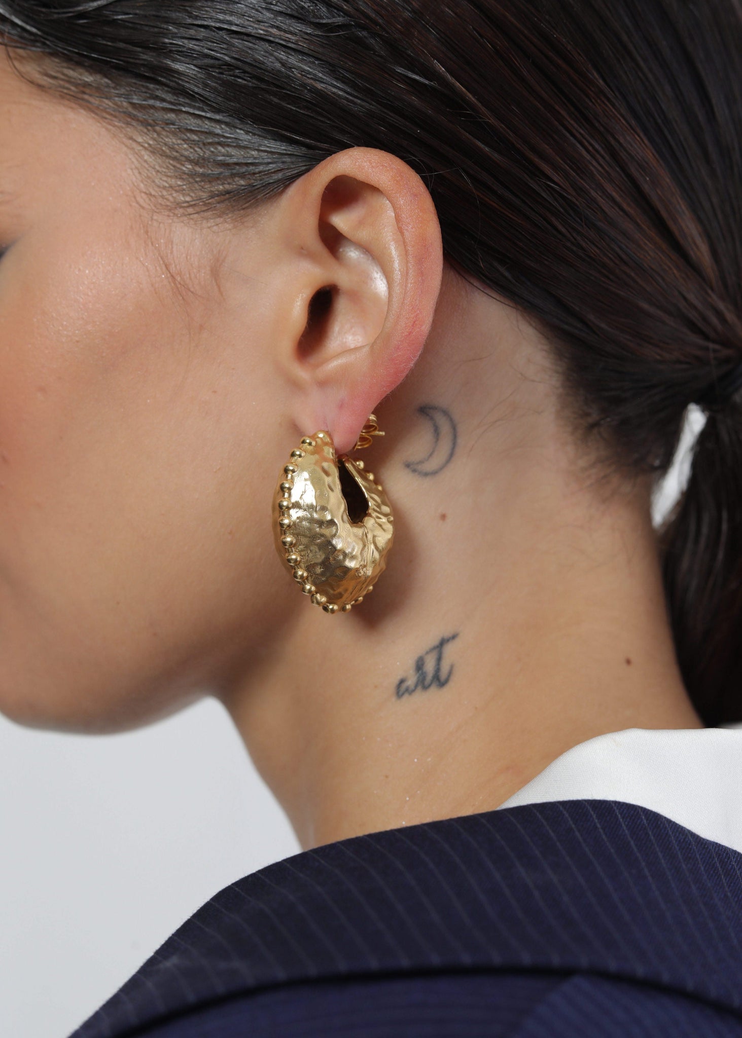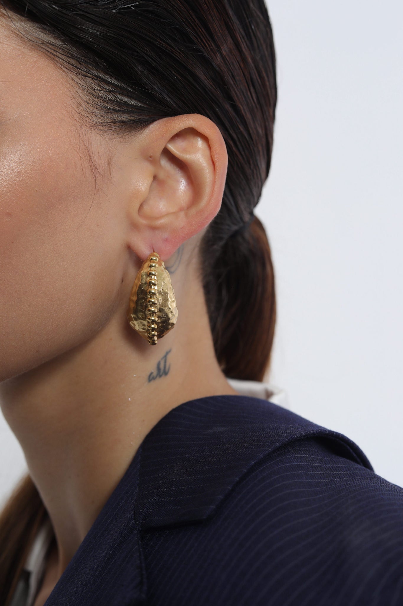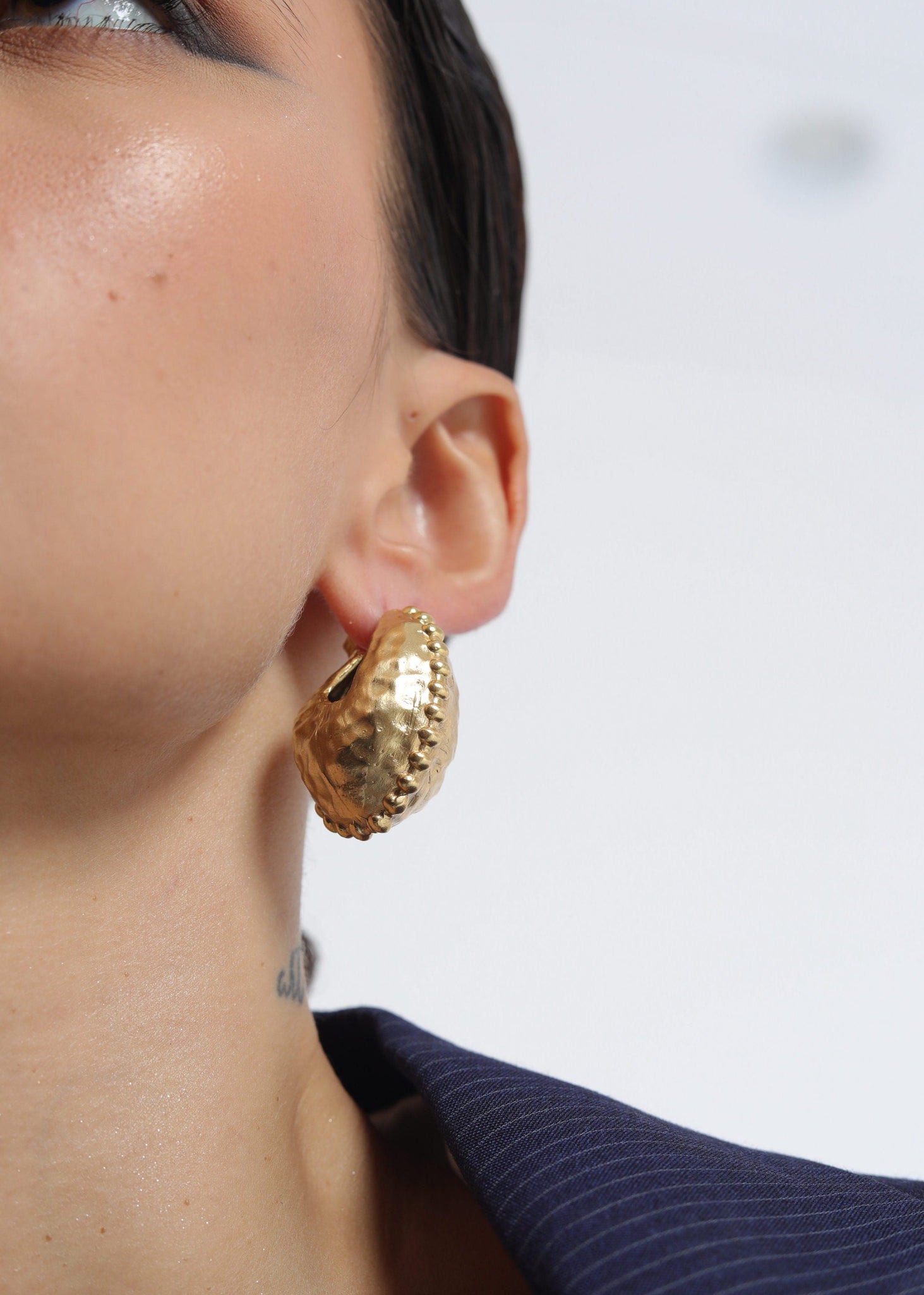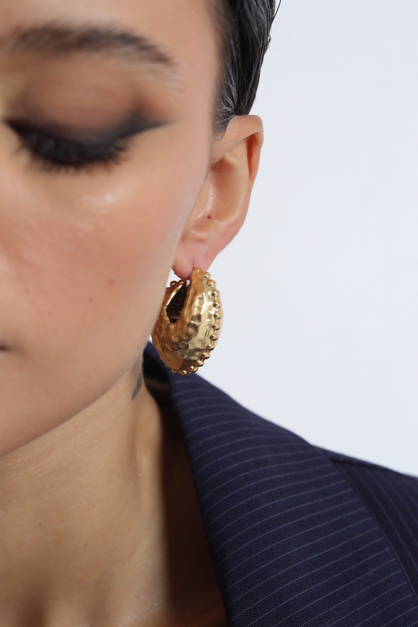 Sculpted in molten gold with a hammered finish, these chunky hoops are edged with raised beading that adds texture and depth. Compact yet commanding, they strike the balance between raw craftsmanship and modern edge, timeless hoops reimagined with bold volume and artisanal detail