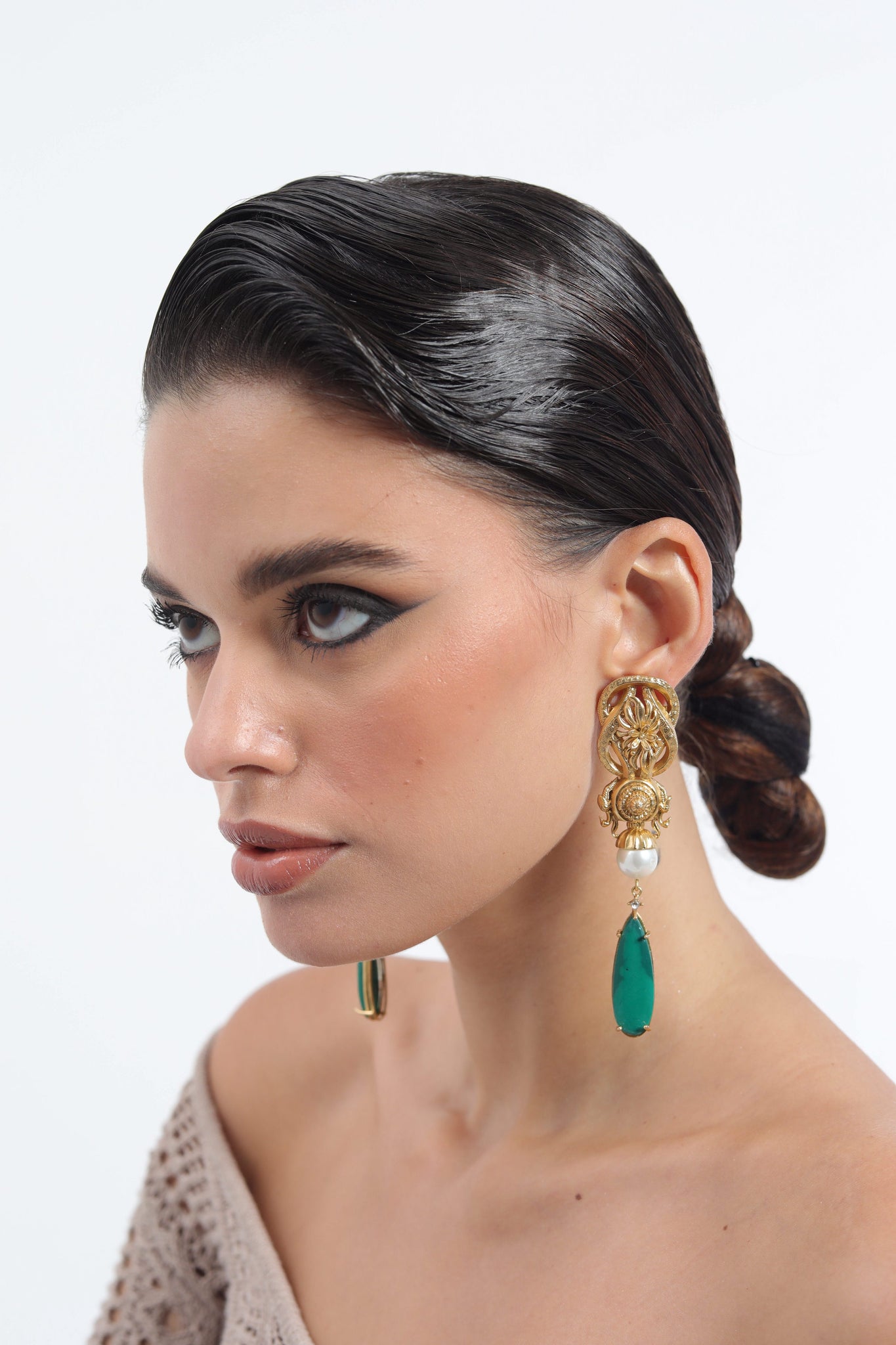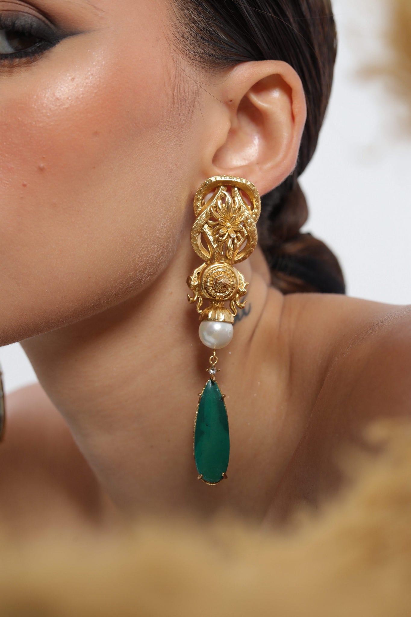 An ode to grandeur, these earrings marry ornate baroque-inspired goldwork with the purity of a pearl and the striking depth of a faux malachite drop. Intricately detailed, they channel old-world regality while retaining a modern sculptural drama. Each element - the embossed crest, the luminous pearl, the emerald-toned teardrop, plays its part in creating a statement piece that feels both timeless and commanding.