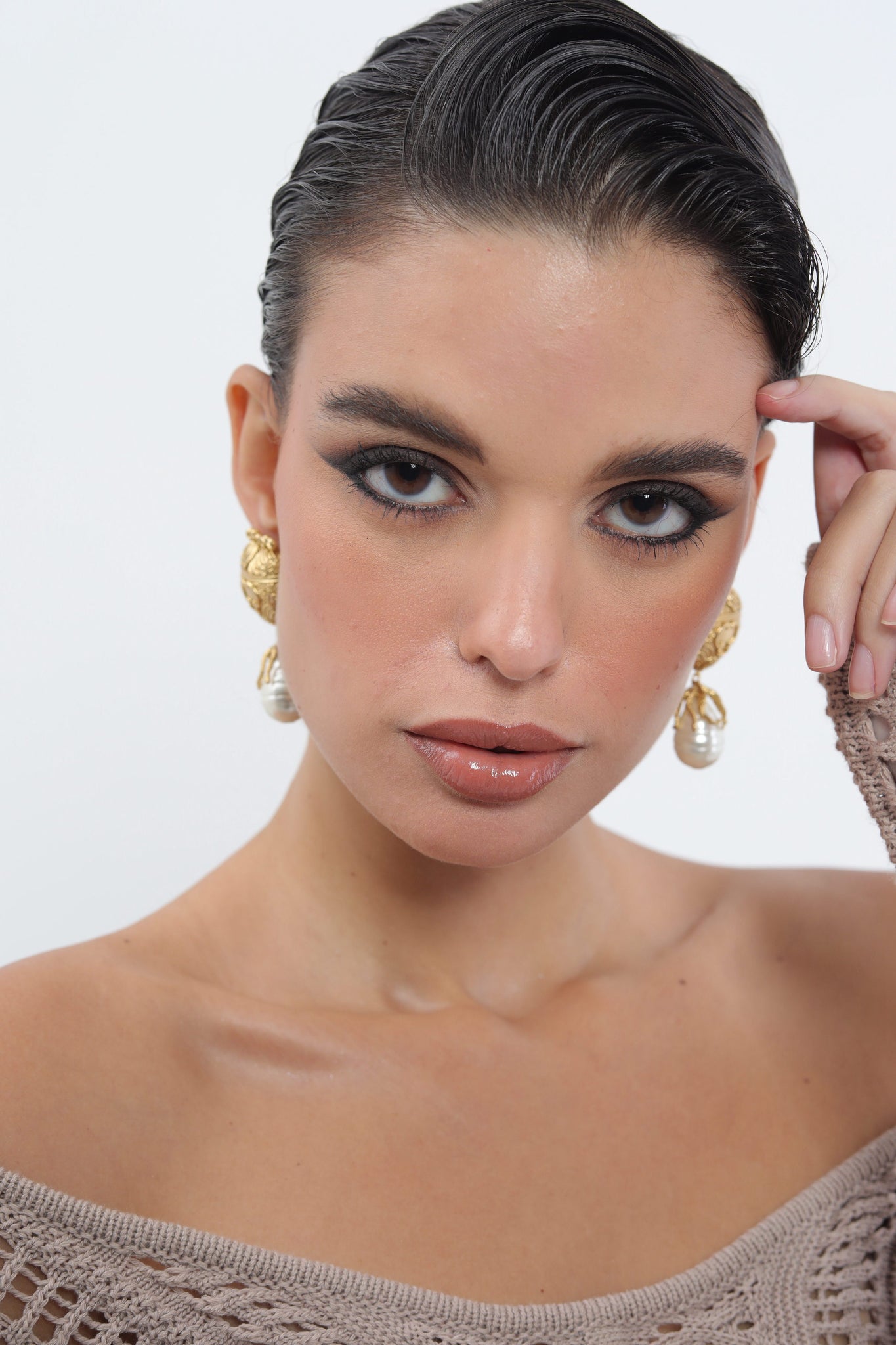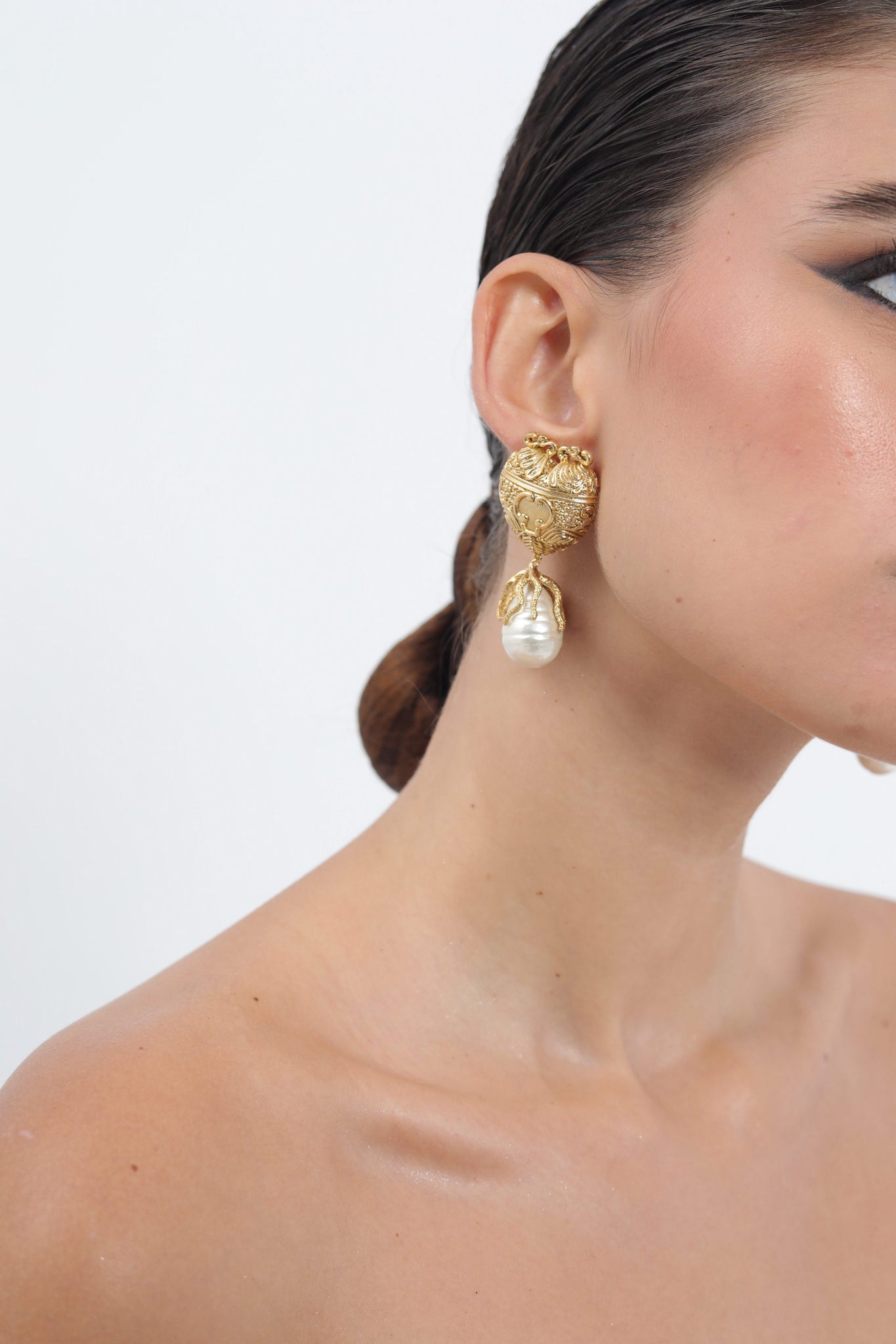 Ornate gold studs, etched with shell pearl detail, descend into sculpted claws that cradle a glowing pearl. The interplay of textured metal and soft iridescence creates a striking duality — drama tempered by elegance, old-world grandeur reimagined with a modern edge.