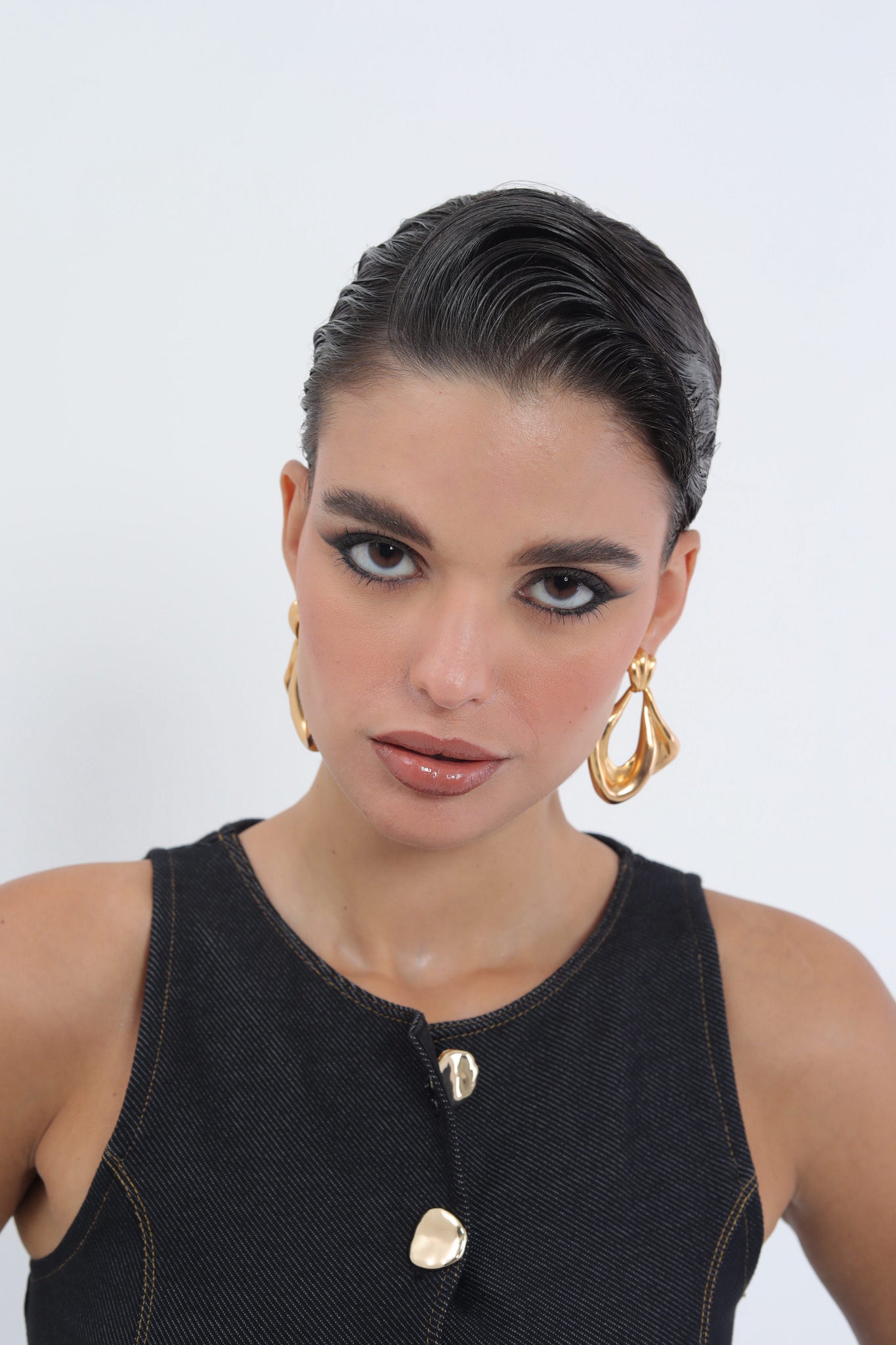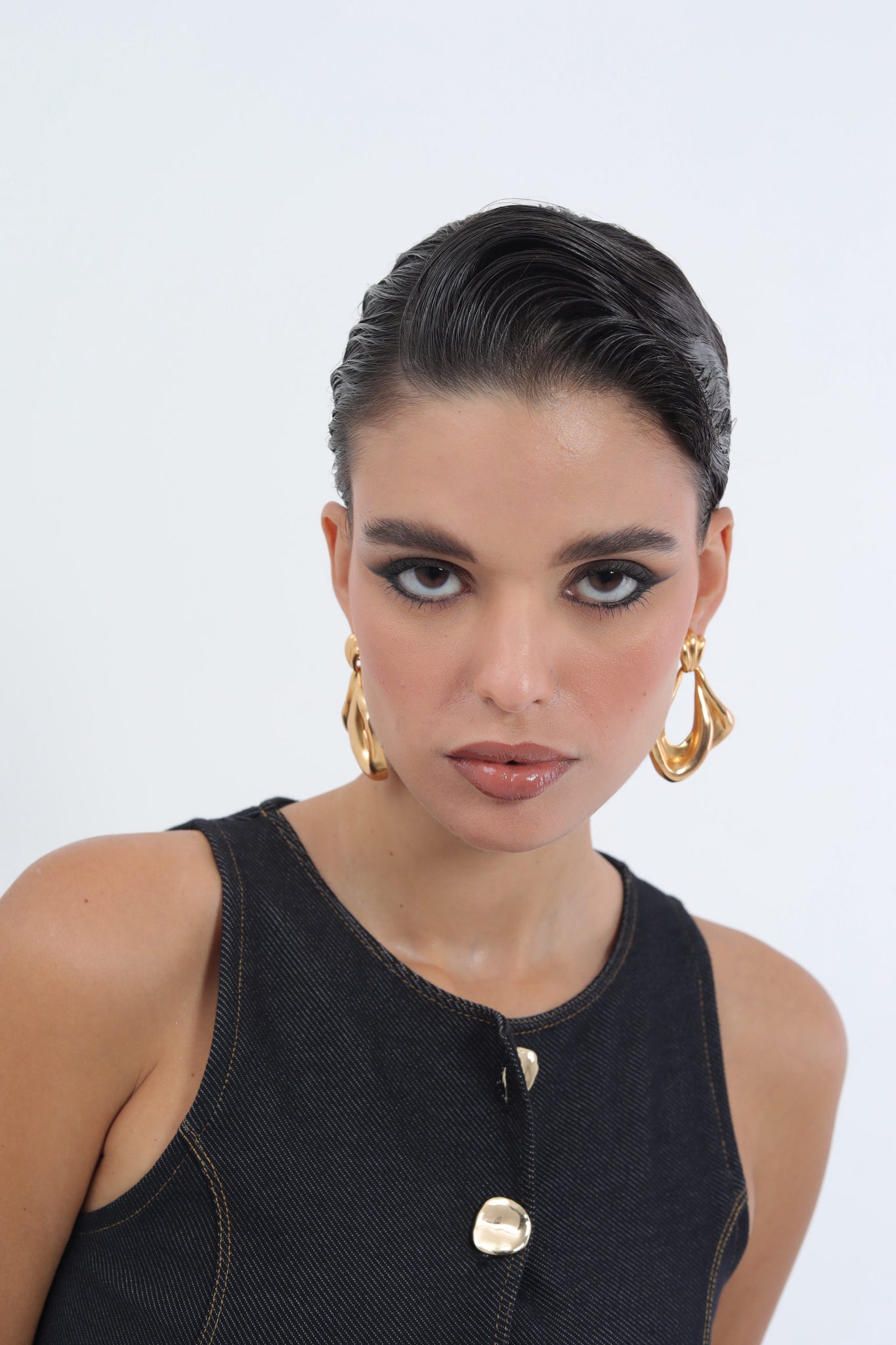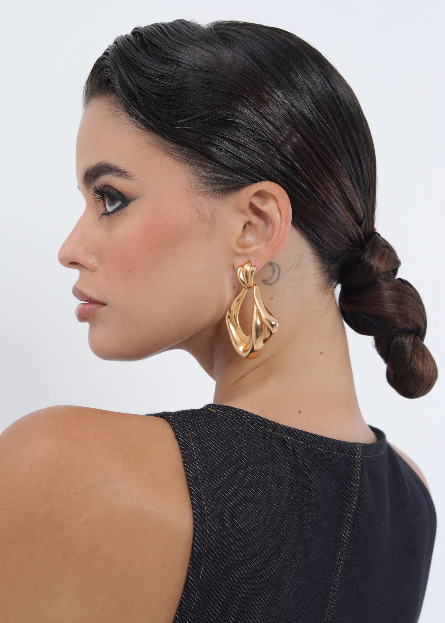 These molten loops echo the language of draped ribbons, fluid, soft, yet powerful. Sculpted in radiant gold, they capture the poetry of movement, as if fabric has been frozen mid-sway.