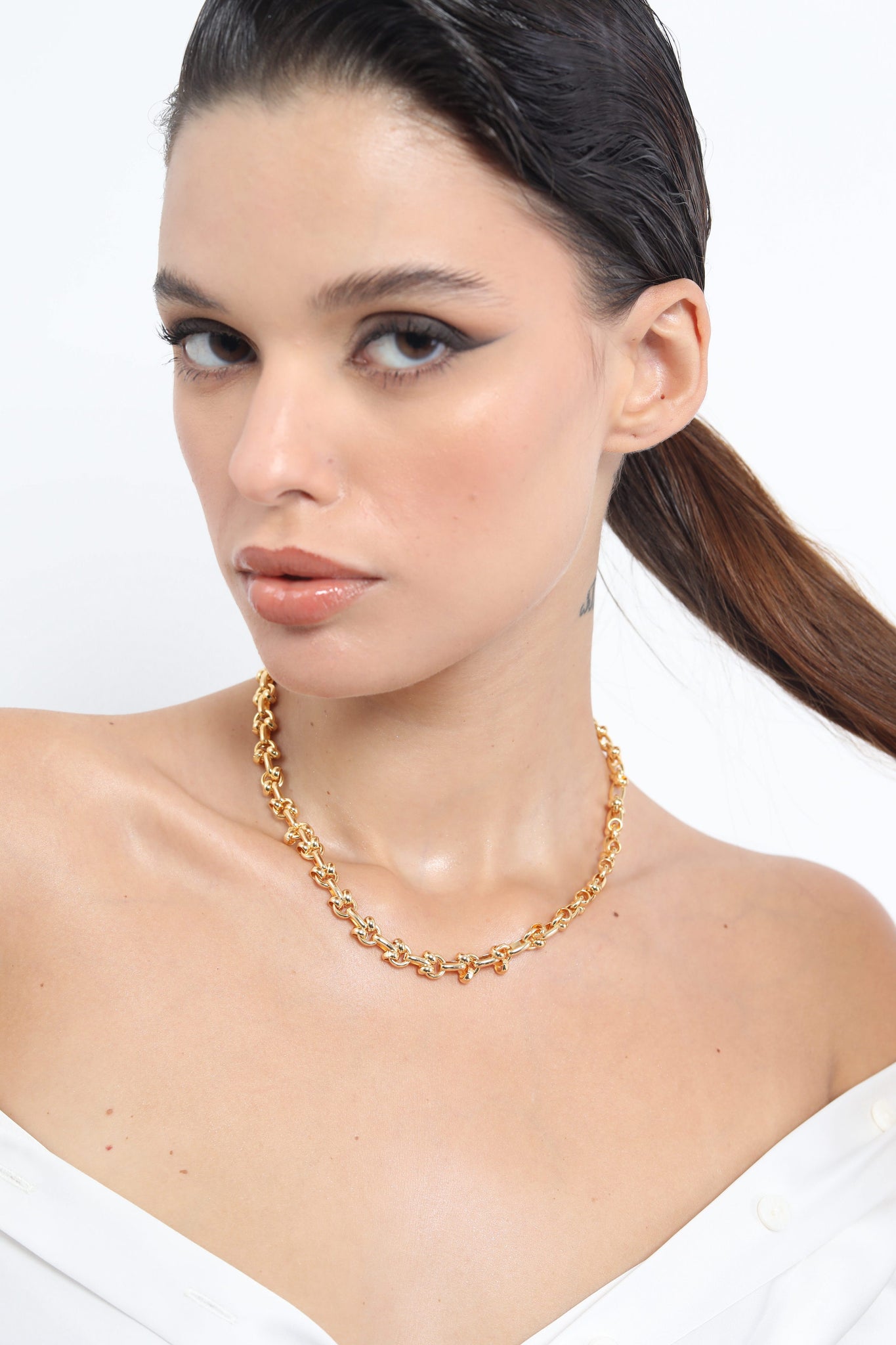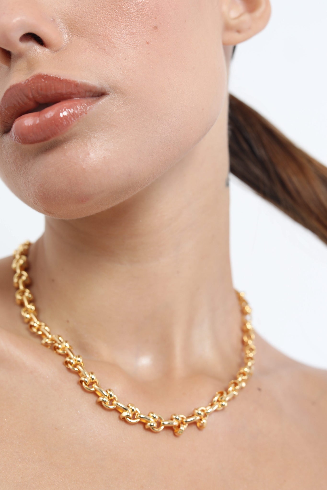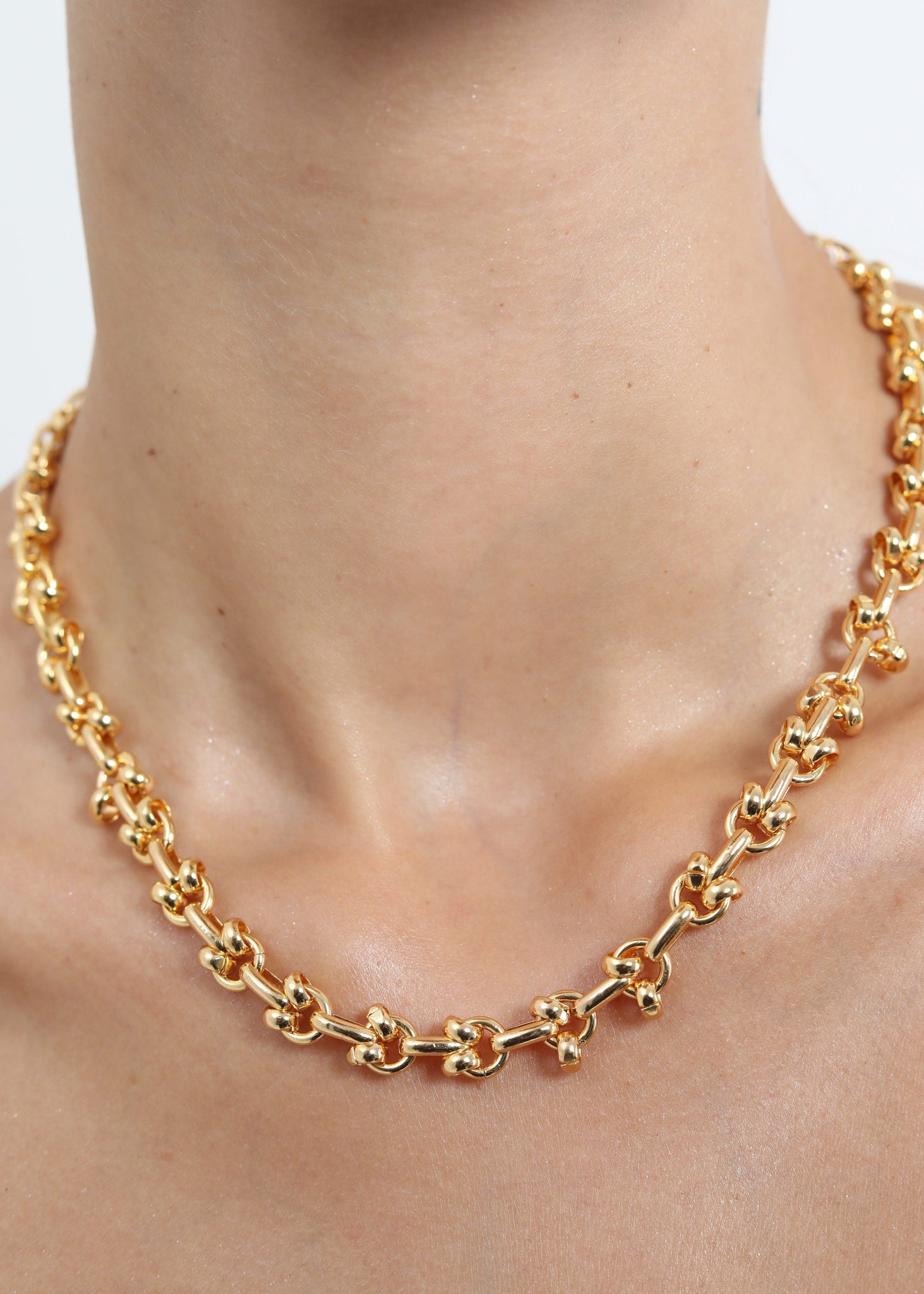 A bold gold link chain reimagined with sculptural knots at every joint. The design adds texture and dimension while keeping the silhouette sleek and versatile. Strong enough to stand alone, yet refined enough to layer.