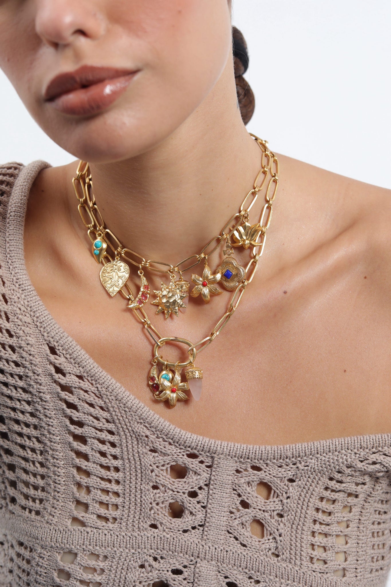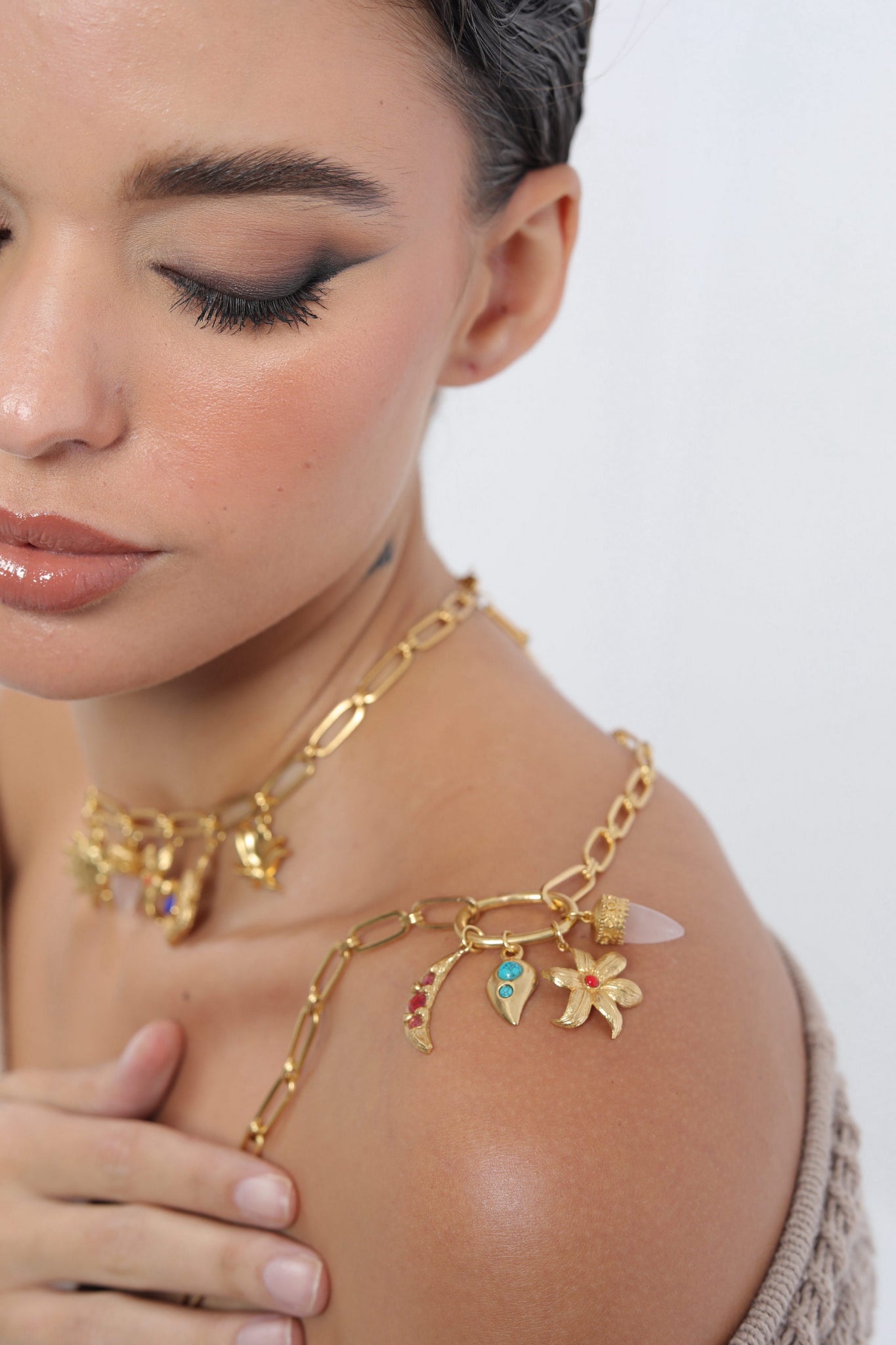 A scaled-down ode to luck and protection, Petit Fortuna carries the same spirit as its iconic predecessor. Suspended on a bold link chain, its miniature charms , from the crescent to the floral bloom and gemstone talismans, whisper stories of fortune in a more intimate, everyday form. Dainty yet powerful, it’s a modern amulet meant to be worn close, always.