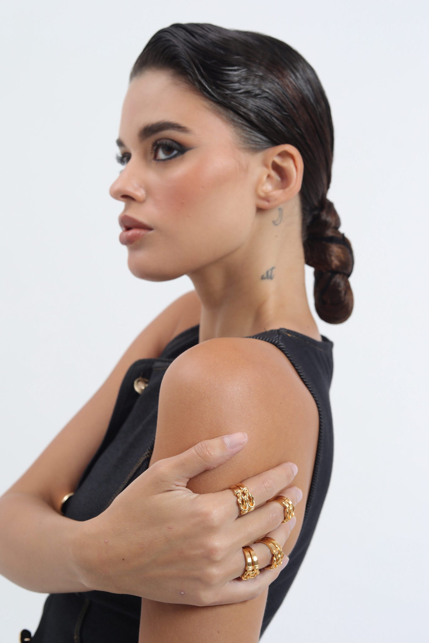 Sculpted in bold gold links, these rings channel raw structure into refined form. Graphic, weighty, and unapologetic, they bring the language of chains into the realm of adornment. Designed to be stacked or worn solo