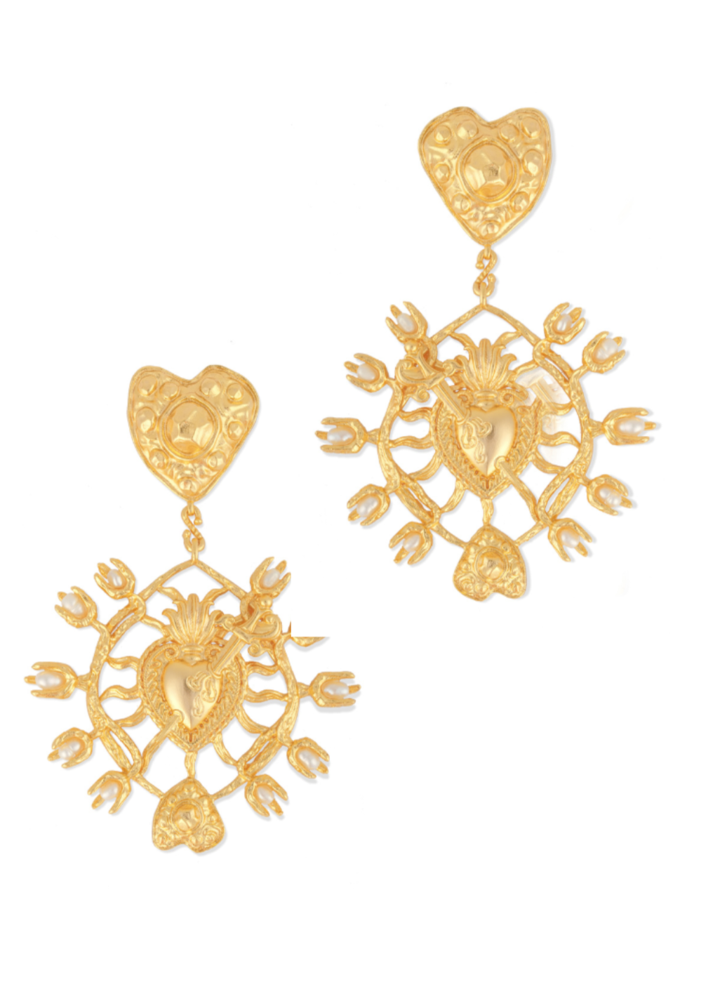 Adorn your ears with the poetry of statement earrings: hearts and daggers dance in a delicate balance, cradling a medley of 20 pearls in uneven metallic embrace. As they sway, gentle yet commanding, they whisper tales of contrasts and harmony, turning heads with every graceful motion.